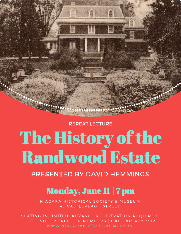 The Niagara Historical Society & Museum talk on Randwood: A second session for the talk will be Monday, June 11th at 7 pm.